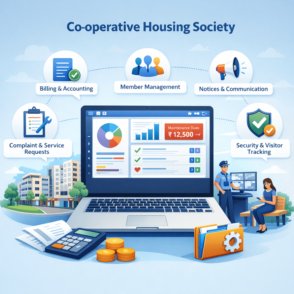 Our Co-operative Housing Society Management Software is a comprehensive digital solution designed to streamline all society operations on a single, secure platform. It simplifies billing and accounting, member management, notices, and service requests while providing real-time insights through an intuitive dashboard for better decision-making.